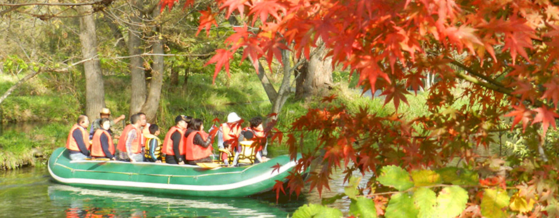 大王わさび農場沿いの蓼川では、大型のゴムボートを自分でパドルを持って漕ぐスタイルで「クリアボート」を